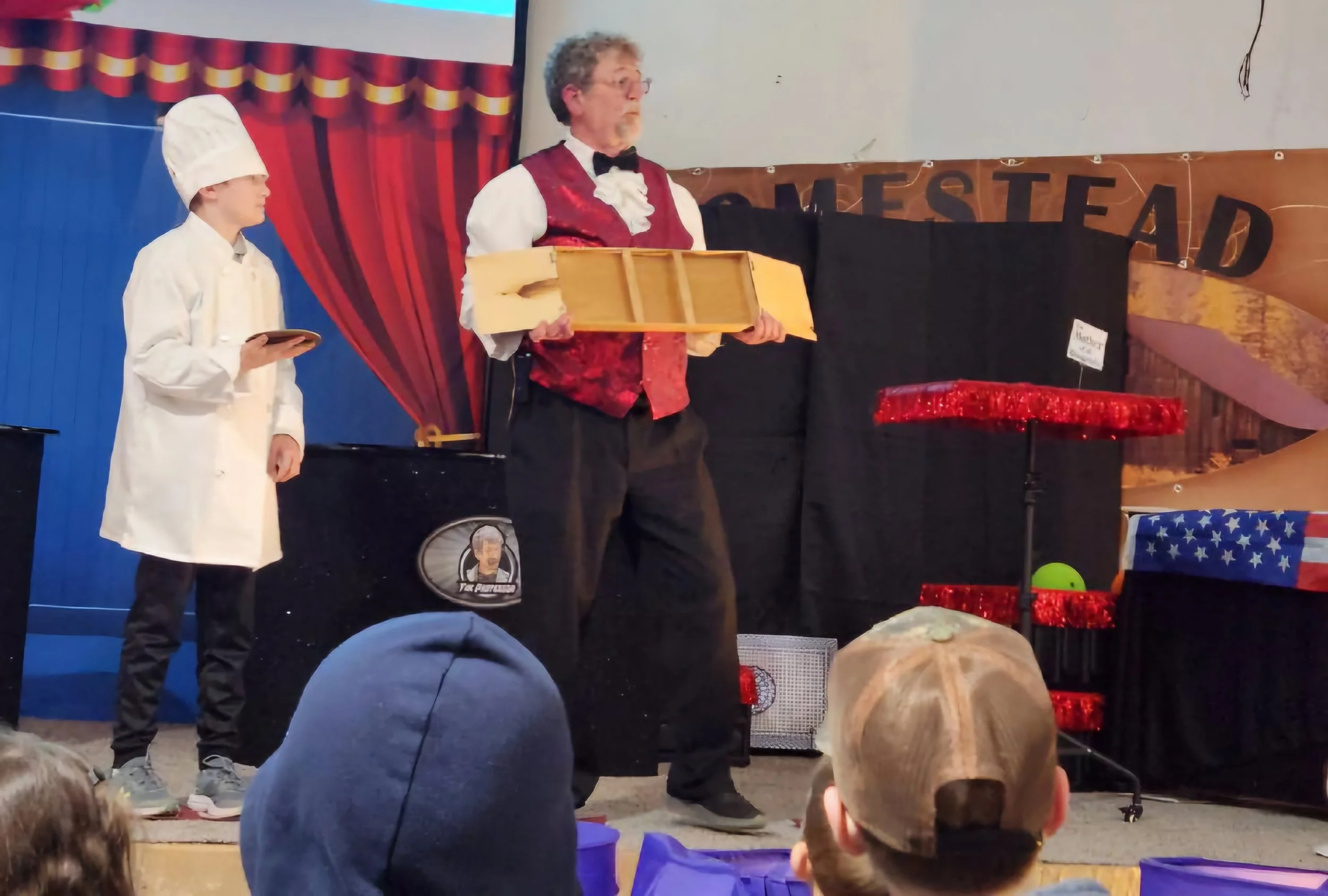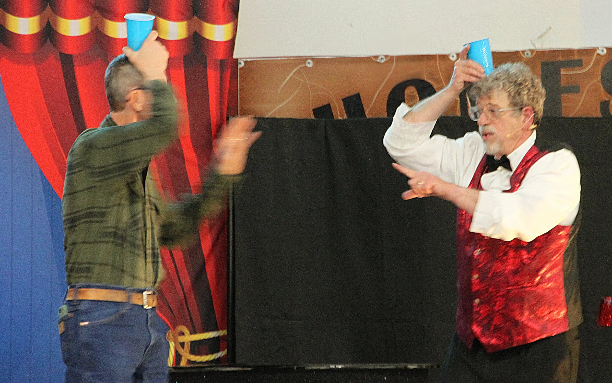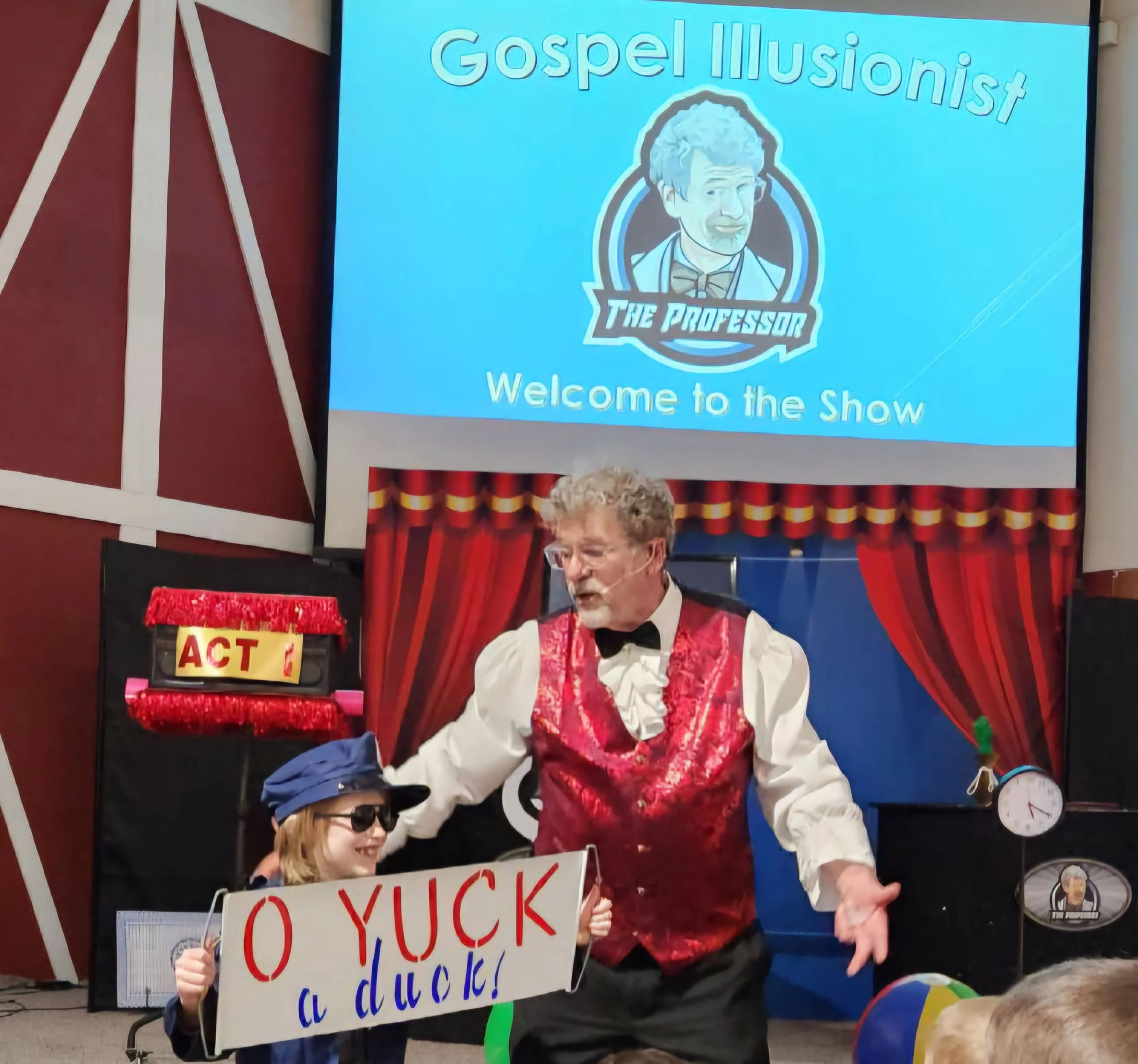 Watching The Professor show his skill at illusions and tricks was a treat for my wife and I and our children and grandchildren. What fun it was to participate and to experience the laughter and joy in everyone that attended. From beach balls and silk scarfs to vanishing and reappearing objects the evening was full of intrigue and mind-bending illusions. Our volunteer “Yuk a duck” security police was also a highlight and is testimony to Jim’s love of children and getting them involved in the evening fun. I especially appreciated the gospel being part of the presentation. I felt that what was done in word and deed was done for the glory of God and enjoyment of all.